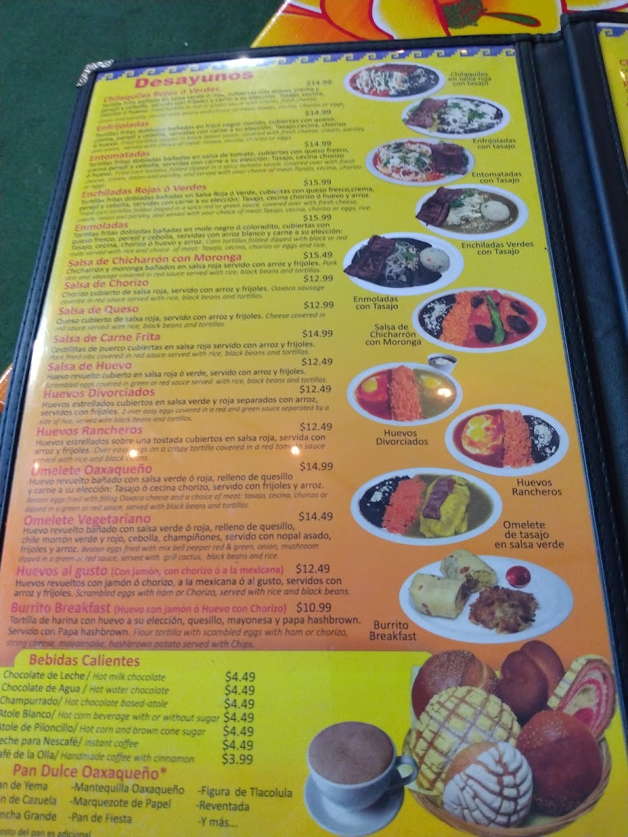 The menu offers a variety of traditional Oaxacan bakery items alongside savory dishes and beverages. It is structured to provide options suitable for breakfast, light meals, and casual dining experiences.